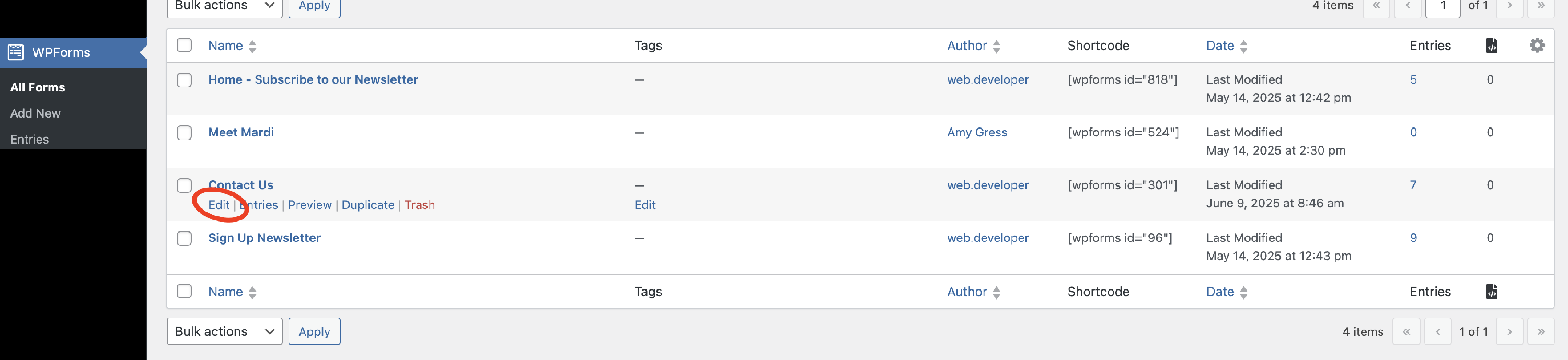 - Go to WPForms > All Forms and find the form you want to edit. Click Edit.