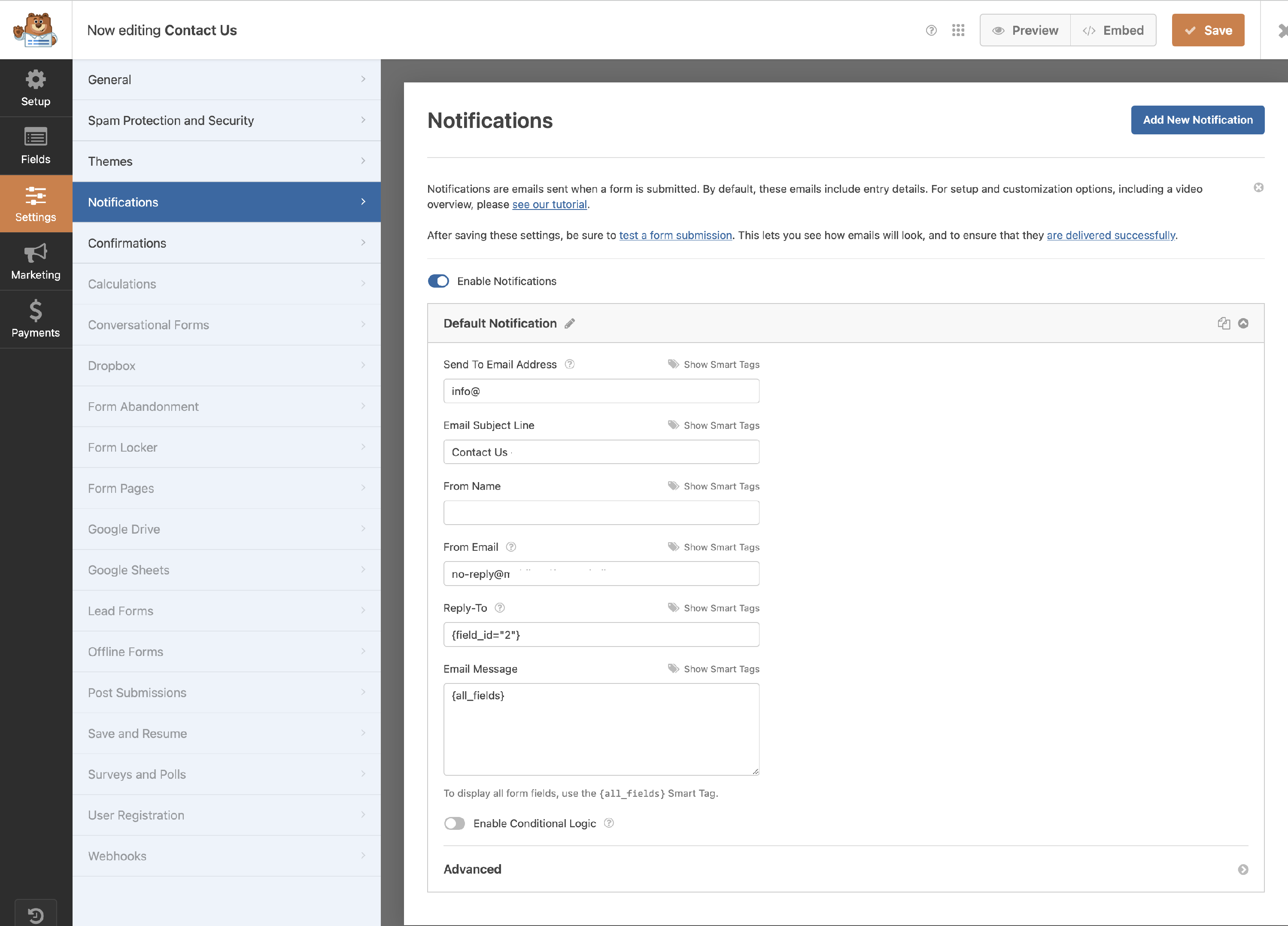 Under Send To Email Address, update the email address to whoever you want to receive the notifications.